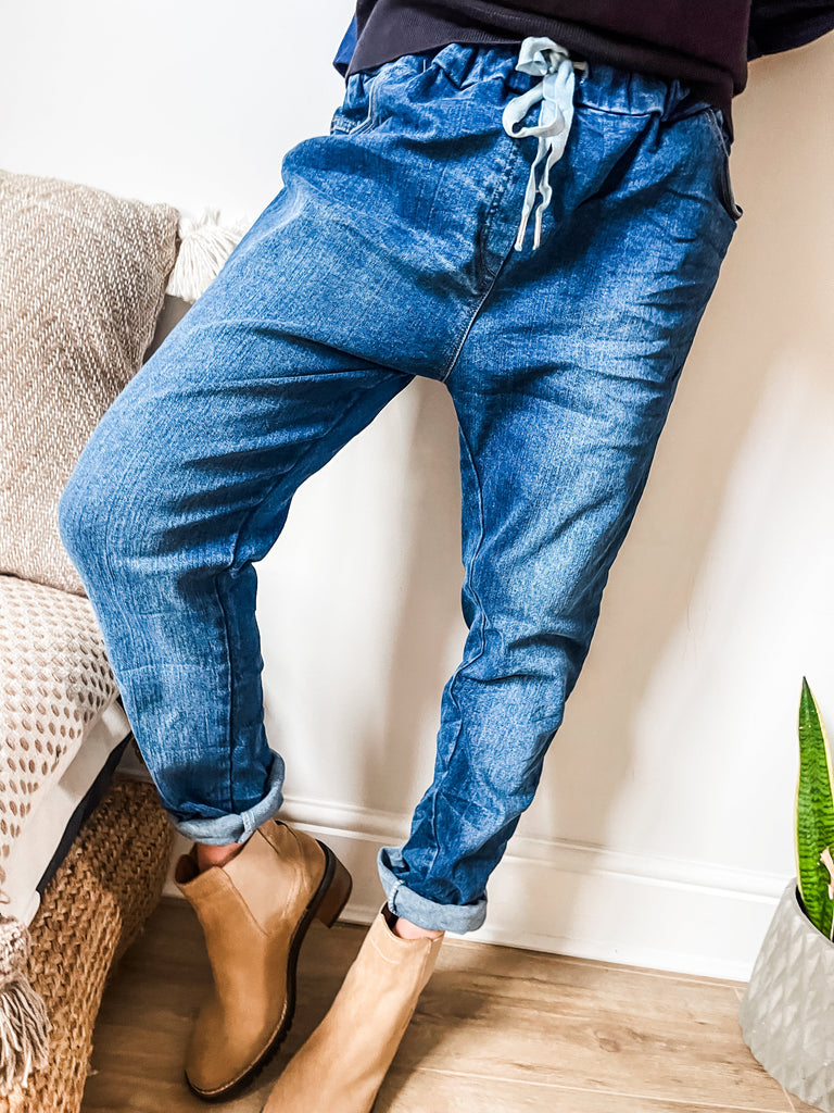 - Denim Magic Pants: The perfect more comfortable replacement to jeans. The stretchy material is designed in a tapered leg with a drawstring waistband to achieve the perfect fit.