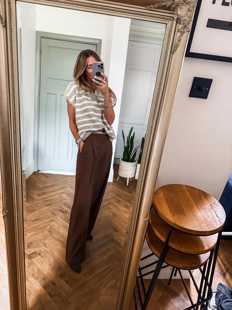 Add a fresh edge to your look with this collared striped knit vest. With its cropped fit, short sleeves, and bold stripes, it’s a modern take on a classic style. Lightweight and versatile, it’s perfect for layering or wearing solo when the weather warms up.