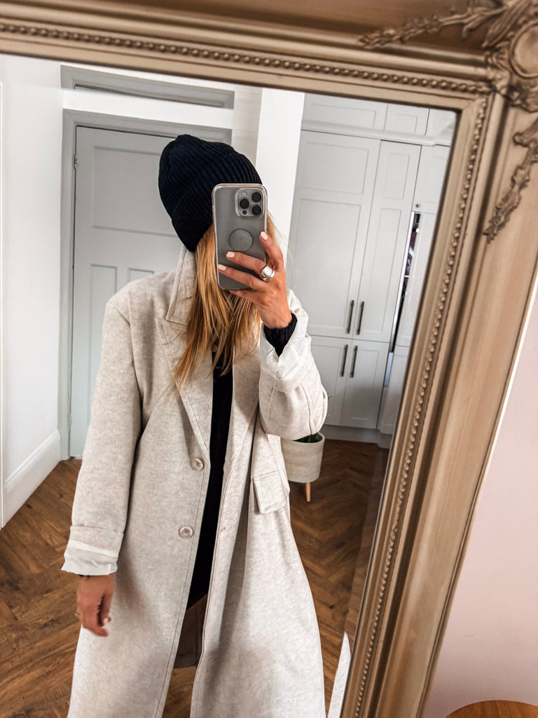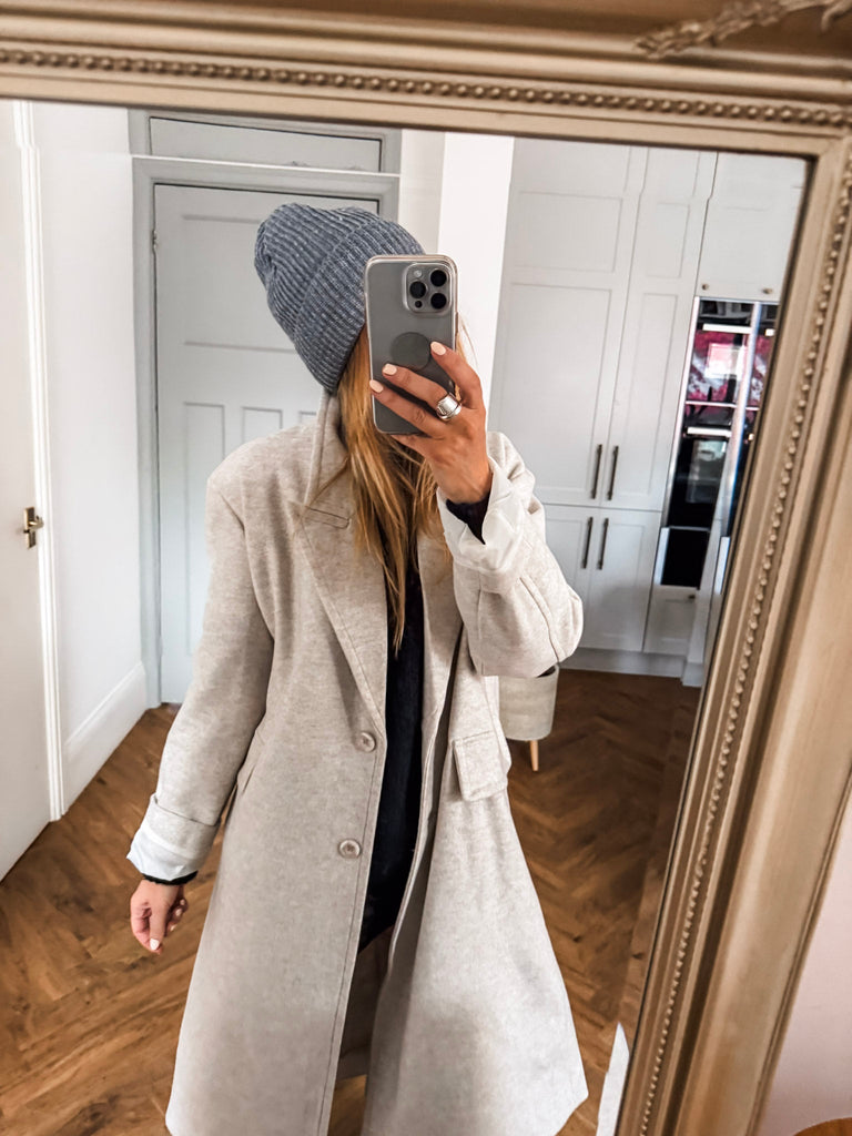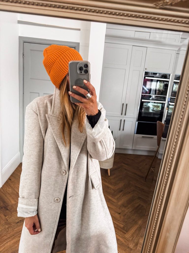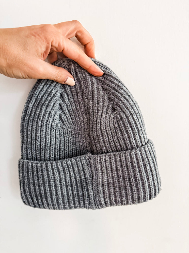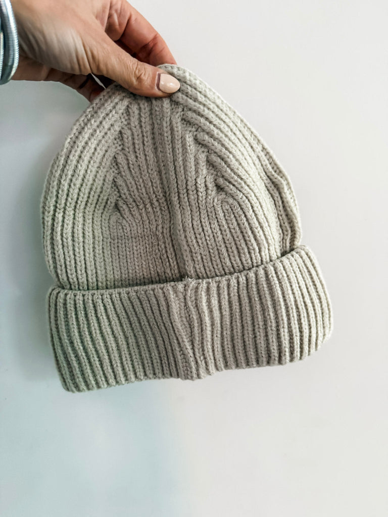 Beanie in a soft rib knit with a turn-up at the hem. Style this with one our coats this winter!