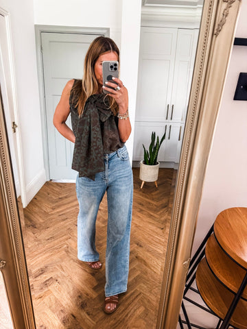 Embrace effortless style with this sleeveless blouse featuring a relaxed A-line silhouette that flatters every figure. Designed with an all-over floral and tribal-inspired print, it brings a touch of bohemian charm to your wardrobe. The high neckline is elegantly finished with a statement bow detail at the front, adding a soft, feminine touch. Crafted from lightweight fabric, this blouse is perfect for warm days or easy layering. Finished with a subtle button closure at the back for a polished look.